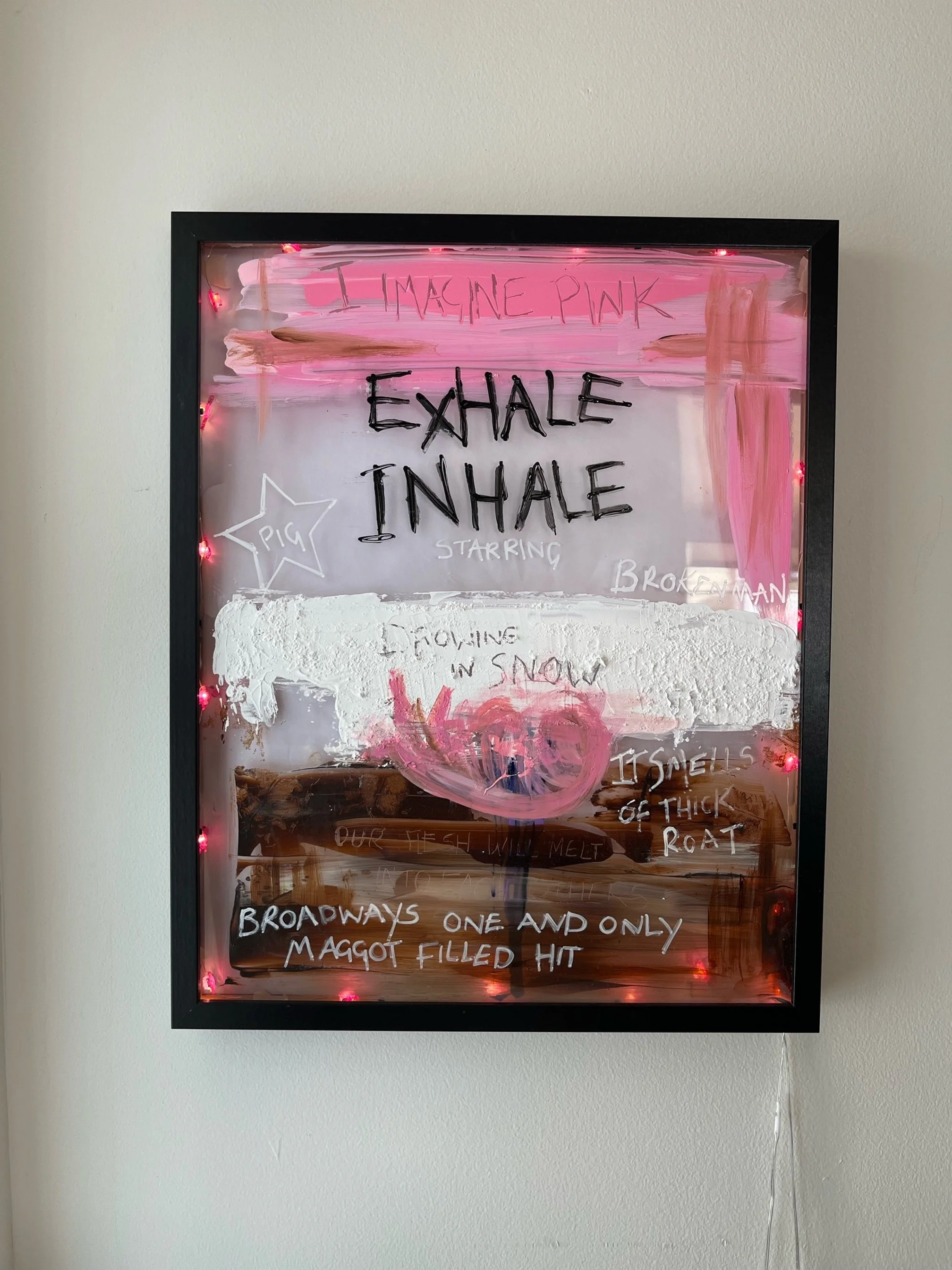 Sorry, I've jumped to what I actually created. At first it was going to be just a theater poster that said, “This is the show starring Pig,” because Pig is the main, pivotal character in this piece of prose. It does have the Man, but Pig is the star. Then, I thought, “Mmmm, needs to be a bit more than that.” I wanted to paint on a piece of acrylic because I paint a lot on clear surfaces. I love transparency, when you paint something and you can still see through it. Then I realized, “Oh wow, this could be a lightbox! Never made one in my life, but I'm going to have a go.” So I created this lightbox, which is like a poster itself, with the lights around it which gave it depth. Also, my favorite color in all my artwork is pink, and that’s great within this piece. One of the lines is “I imagine pink,” and I put pink lights within it so it was still personal to me. And as we know, most pigs are pink! I wanted to keep that running theme.