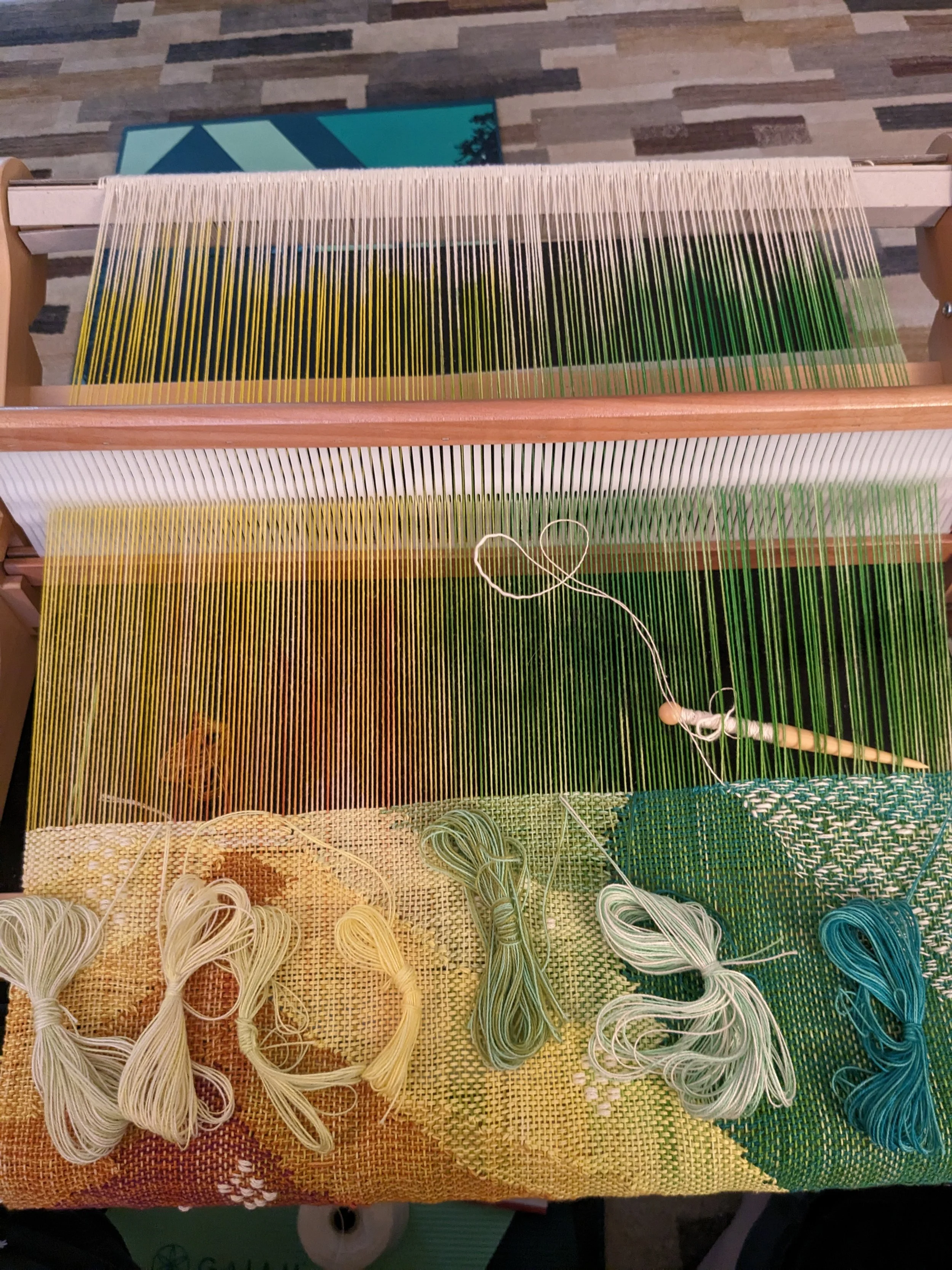 Instead, I took it up a step to my tabletop-sized loom, pulled out my paints, and just played with color that way. I wanted to see if I could get the color blending that I envisioned through a combination of multicolored painting. The first threads you load on your loom are called the warp threads, the ones that go vertical in the loom. I thought if I colored those in a rainbow way to play with that “diffusedness,” then I could play with multicolored weft, as well, and just play with color and texture together.
