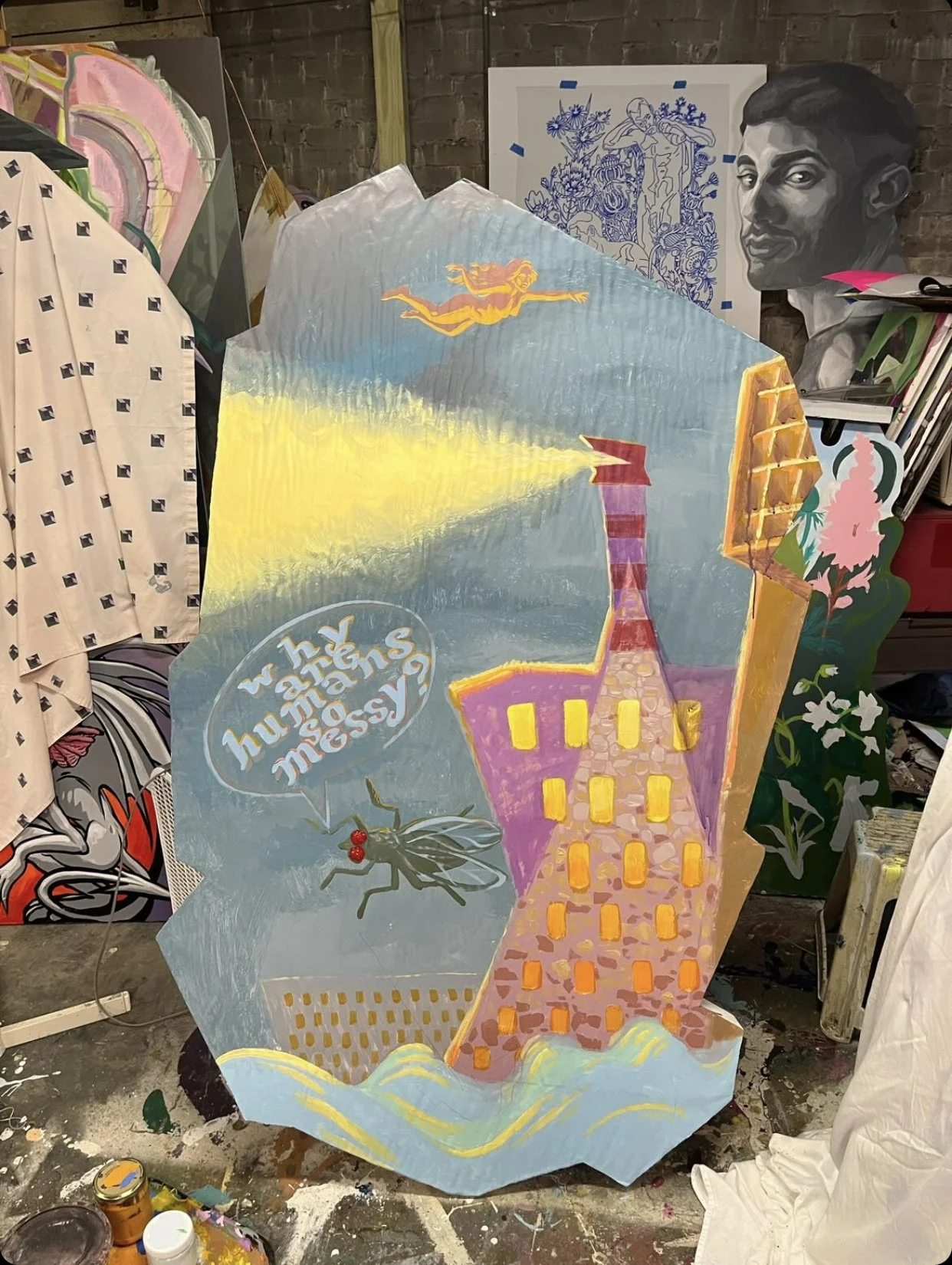 I had this foam from a previous project. I put some paper over it and cut it into a funny shape, and then I started painting on that with acrylic paint. I really wanted the phrase in there because I loved how those words in the video vibrated. And it's such a good little nod to the fact that, you know, “Humanity's a little messy!”