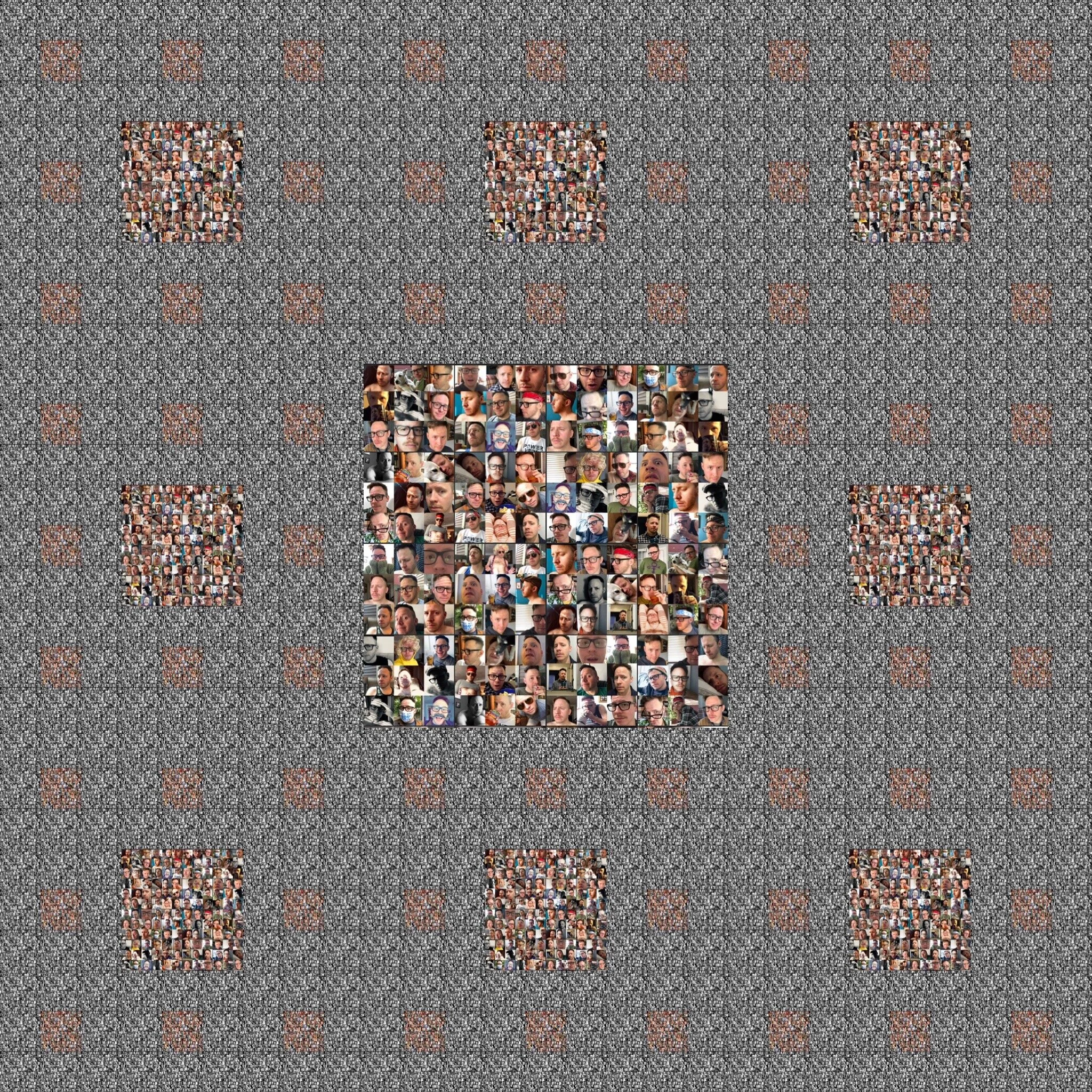 I wanted to illustrate that monotony, to show what always being in the same place actually looks like. I combed my phone for selfies I took at home since the pandemic began. It turned out to be about 60 pictures. I don't know if that's high or low or normal, but it's what I got. "Here's me at home in the kitchen. Here's me at home with a hat on. Here's me at home in the summer. Here's me at home with a mustache. Here's me at home looking tired, silly, sad, dramatic, cozy..." I arranged them in groups and arranged the groups in groups, so now it's a billion selfies, all taken in my small, stupid apartment since March.
